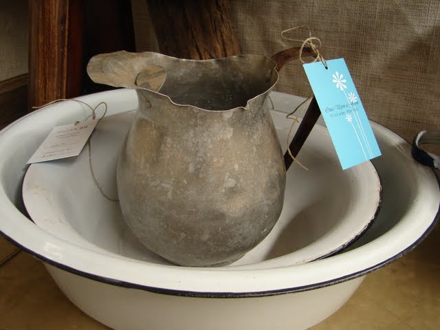 I find these tin pitchers so useful. They look so great as vases but I also like to actually plant in them and have them on a table on the porch. This pitcher actually appears to have a slightly ruffled top edge but it is just normal, beautiful wear.